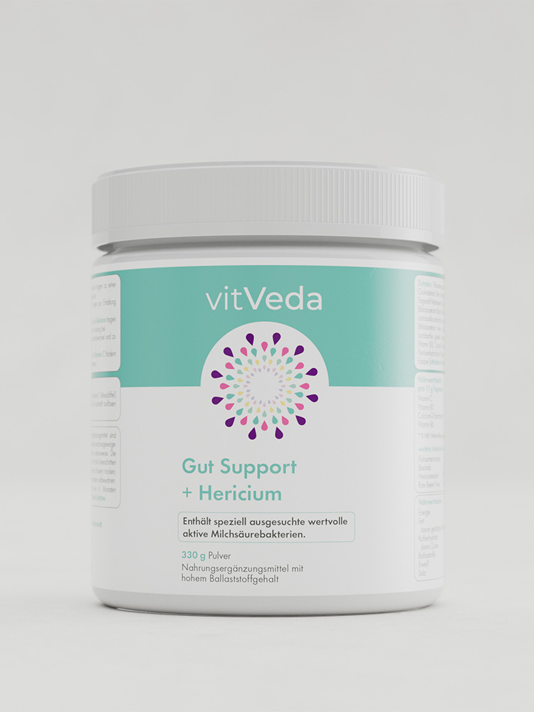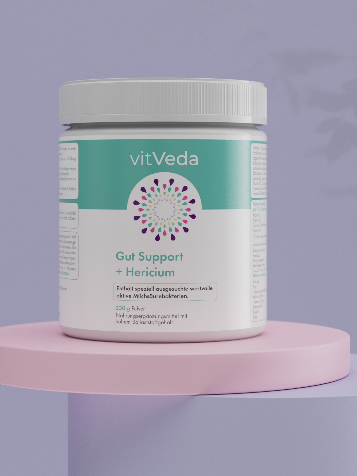 „Gut Support + Hericium“ von VitVeda® ist eine wasserlösliche Darmaufbau- und Pflegekur zum Einmischen und Trinken, die das natürliche Gleichgewicht in deiner Körpermitte fördert.