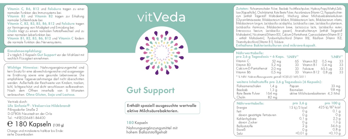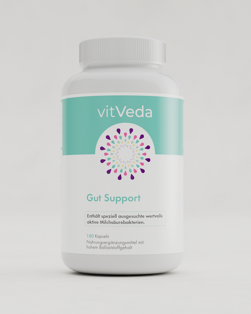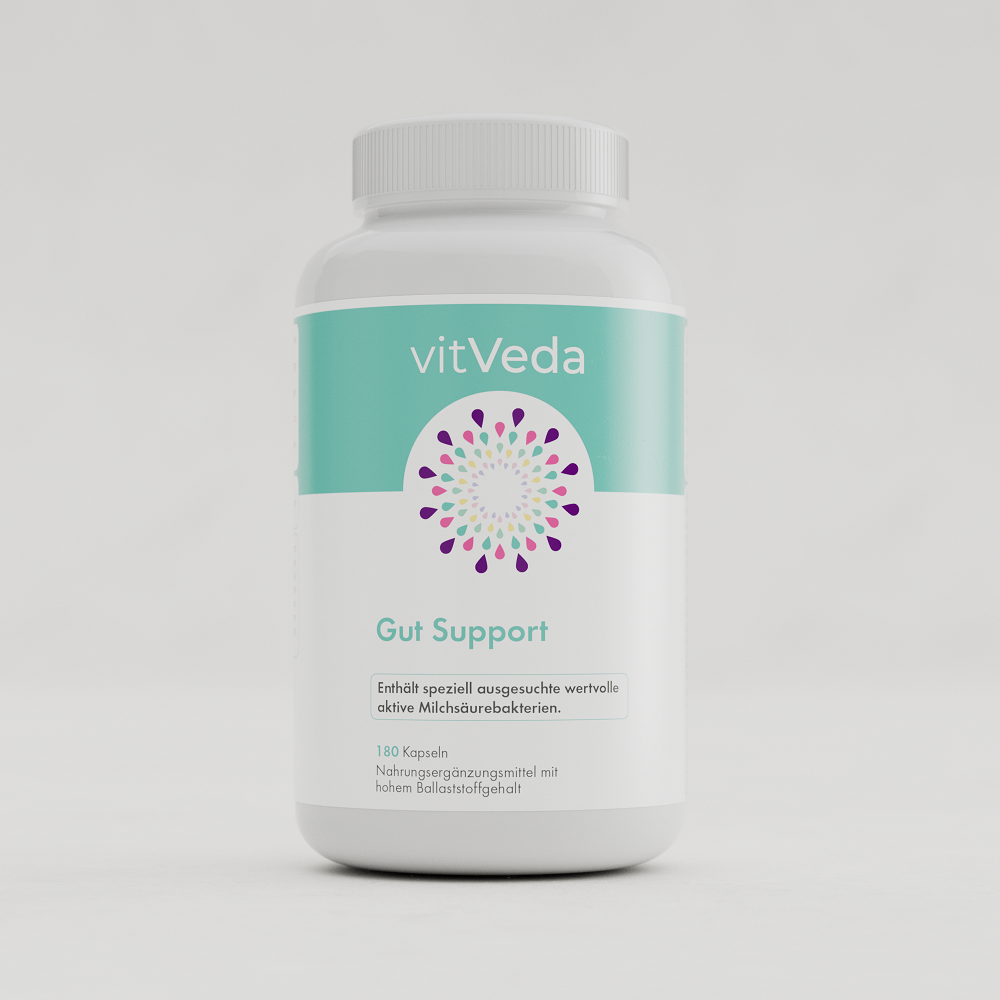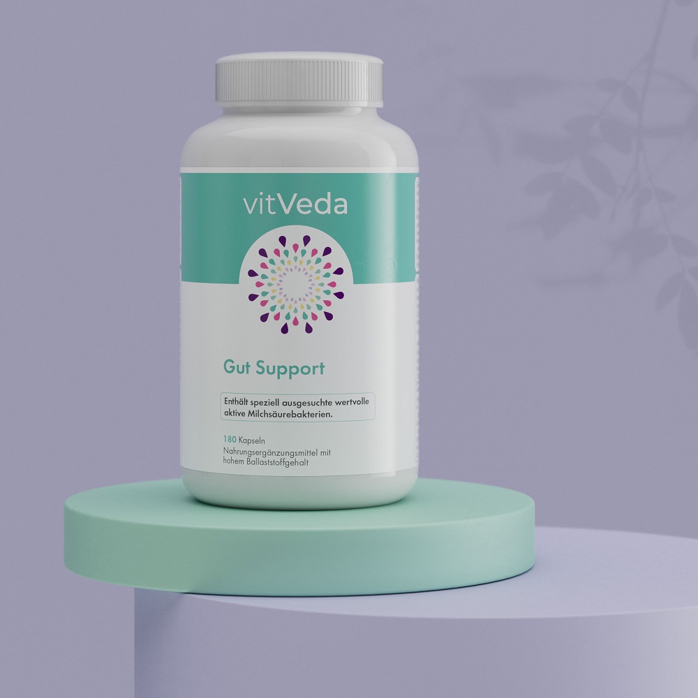 „Gut Support“ von VitVeda® ist eine Darmaufbau- und Pflegekur, die das Gleichgewicht in deiner Körpermitte fördert. Dank der speziellen Rezeptur, welche aktive mikroverkapselte Milchsäurebakterien und wertvolle Ballaststoffe beinhaltet, kann Gut Support für dich und dein Körpergefühl schon nach kurzer Einnahmezeit einen Unterschied bewirken.